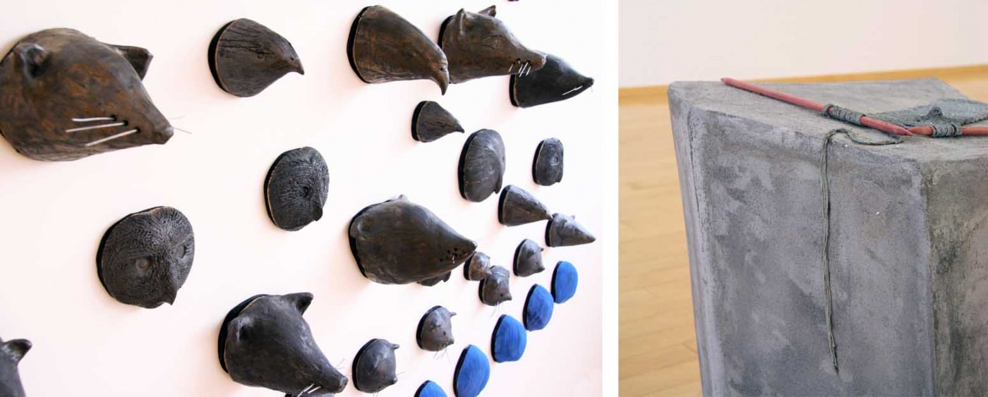 Í verkunum á sýningunni leitar Jónína aftur til bernsku sinnar og mótunarára um miðja síðustu öld. Hún finnur hugmyndum sínum form í skúlptúrum og veggverkum þar sem saman fara fjölbreyttur efniviður á borð við steinsteypu, gler og leir.