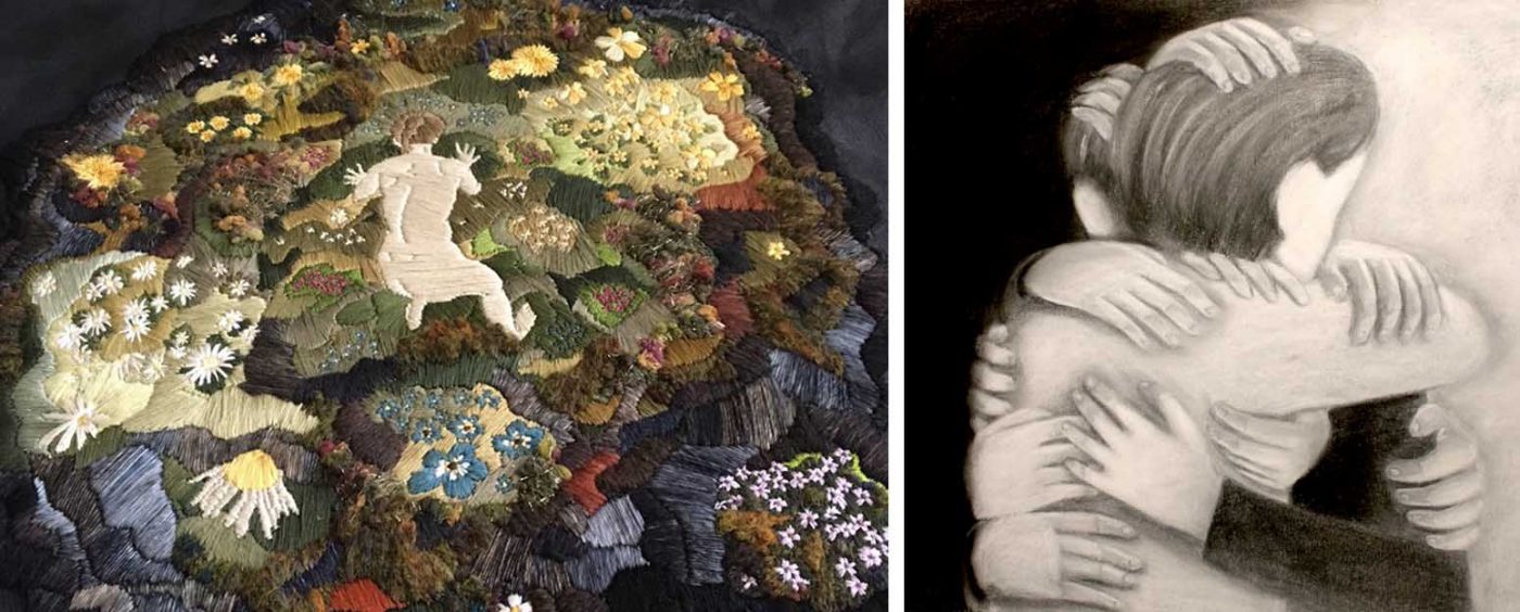 Í útsaumsverkunum færir Sara teikninguna yfir í annan miðil, frá penna á blaði yfir í þræði á textíl. Á móti þræðinum sem er notaður til að móta viðfangsefnið, annars vegar með því að draga upp viðfangsefnið línulega og hins vegar með því að mynda litaklasa, þá notar Sara akrílmálningu á malerískan og expressífan hátt, einkum í bakgrunn verkanna.