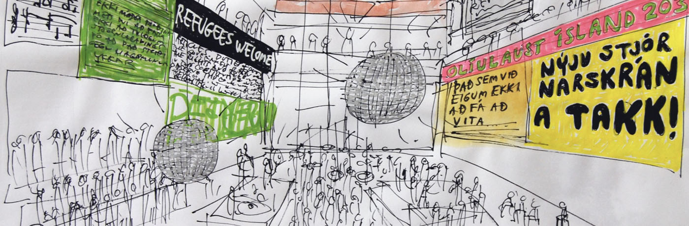 Þegar hálftíminn var liðinn, gekk ég um nágrennið og kom aftur að safninu um það leyti sem listamennirnir, aðgerðasinnarnir og aðrir þátttakendur í nær fimm klukkustunda tónlistargjörningi, streymdu út á götuna og báru borða sem vísuðu upp í loft svo að lesa mátti kröfu aðgerðarinnar að ofan: Nýju stjórnarskrána, takk! Það tók drjúga stund að stilla aðgerðasinnum og borðum upp, sumum þurfti að snúa við, það var jákvæð spenna í loftinu. Nokkrir bílar reyndu að komast framhjá og farþegi eins þeirra reiddist yfir töfinni, steig út og og hrópaði: Færið ykkur! Fólkið hélt sínu striki og neytti réttar síns til að safnast saman, allir þátttakendur með grímu vegna Covid. Þegar við höfðum öll gengið hjá, komst hinn óþolinmóði farþegi bílsins loks leiðar sinnar.
