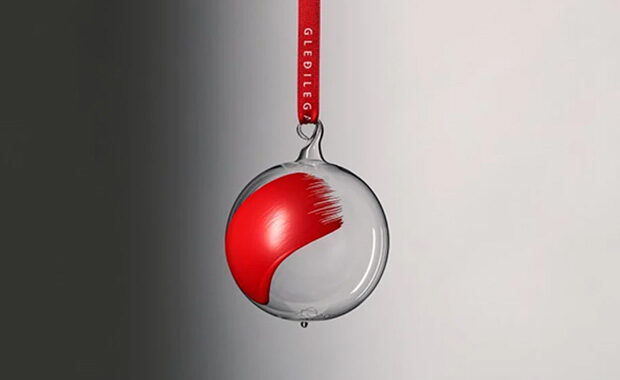 Rauð pensilstroka svífur í trénu, málningarvottur á stökkri glerkúlu, liturinn ljómar og hreyfist, sem tákn um endapunkt ársins.
